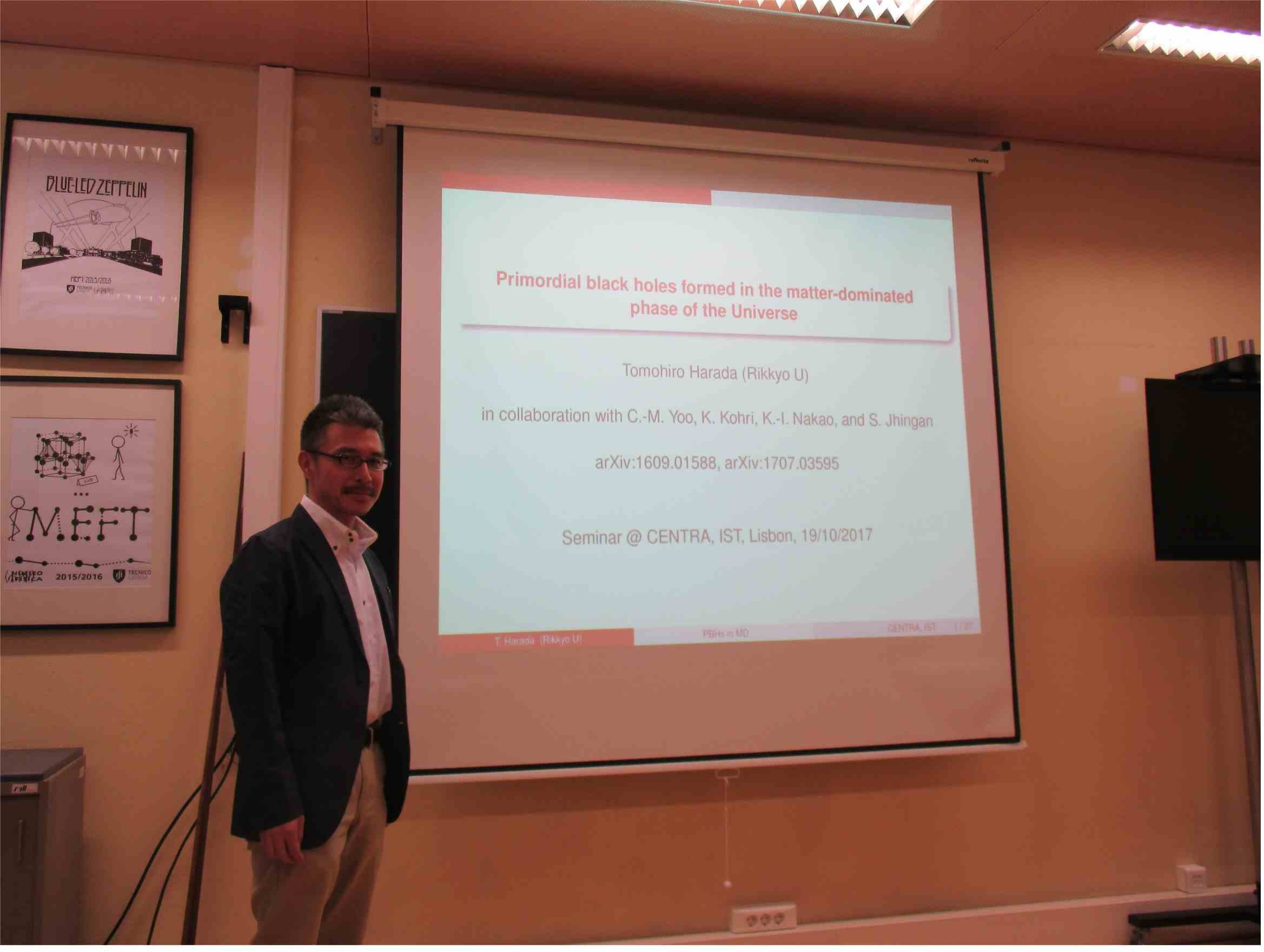 I stayed at CENTRA, IST, Lisbon in October 2017 for a month with the support of Rikkyo University International Academic Research Exchange Programme. I gave a talk to the gravity group there on primordial black holes on 19th of October 2017.