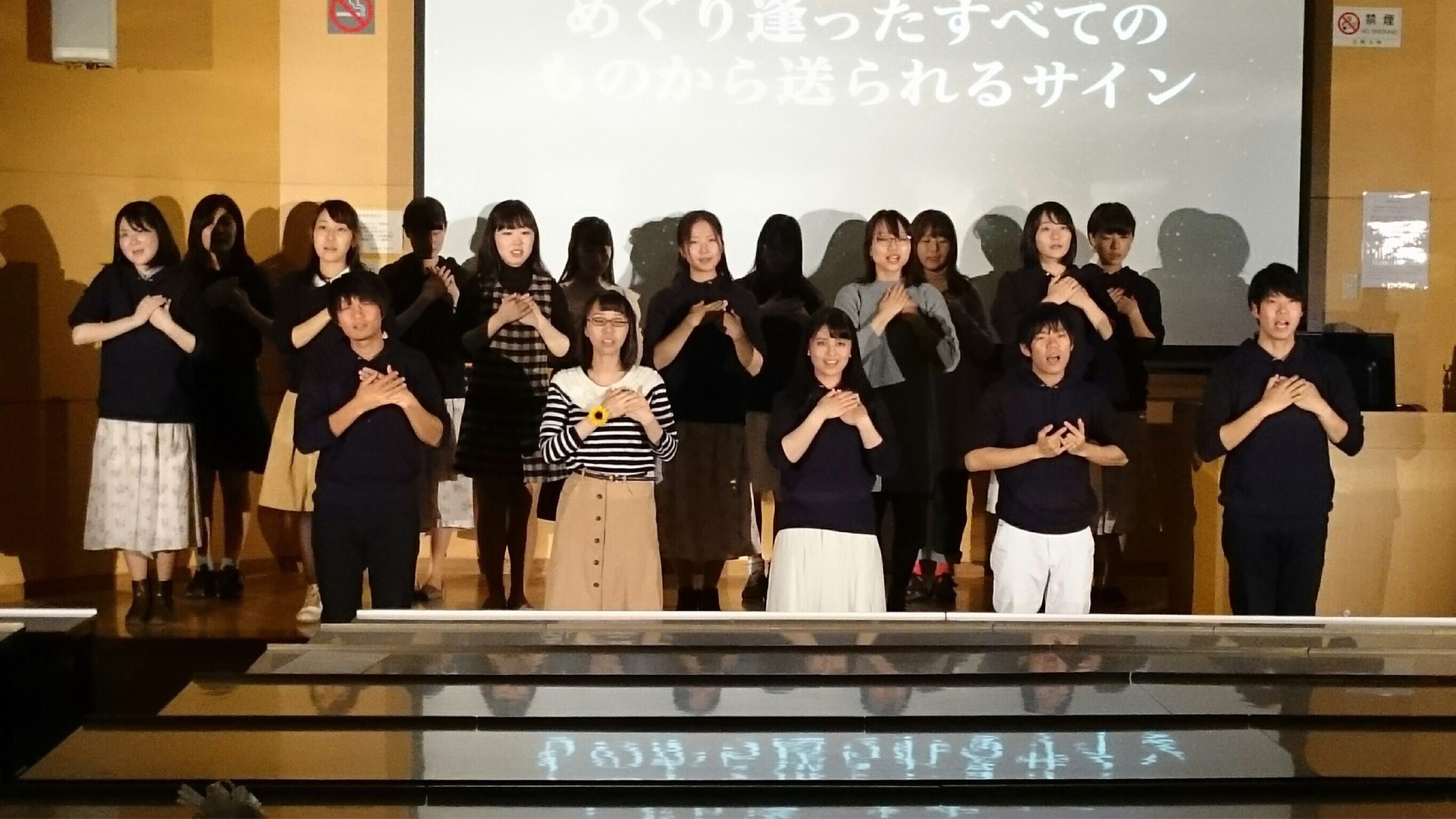 HS)やっぱり、手話を週に3日ずっと学習でやってきてみんなの手話力がだんだん上がってきて、そうすることで耳が聞こえない方、難聴の方とコミュニケーションをとれて、交流の輪が広がっていくっていうことですね。学園祭の講演にも何人か難聴の方が来てくださったりして、そう言った場で会話できます。